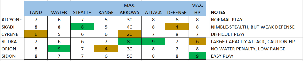 The personas corresponds to both a level-of-difficultly and a kind of “character class” selection. ALCYONE is the default NORMAL choice. SIDON has more health, arrows, defense, making him the EASY choice. The other choices give a variety of game-play challenges, where we will see which selection ends up getting the best game-time score results.