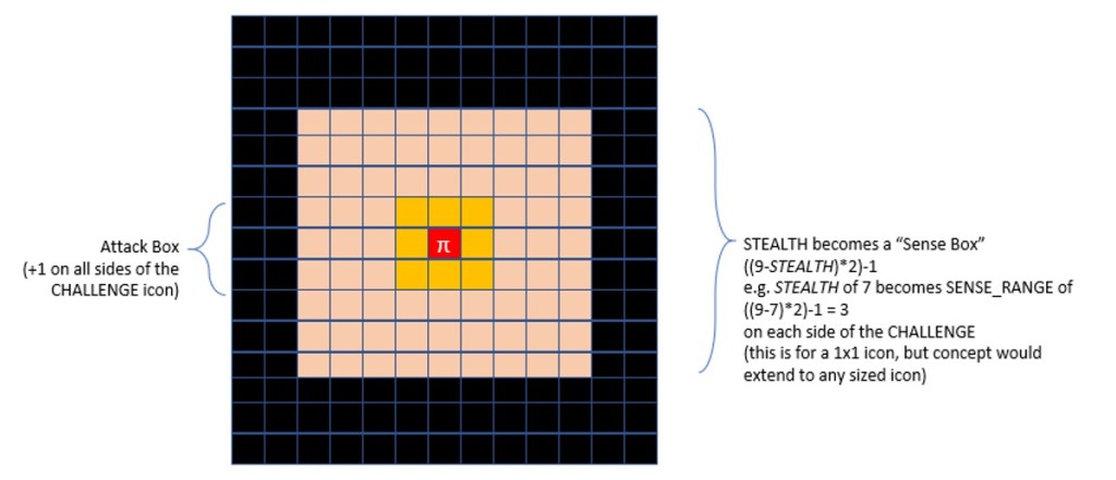 Before game play begins, the STEALTH value is “inverted” into a SENSE range, to effectively indicate how FAR the CHALLENGES can sense the player. Initially we were going to have STEALTH be an RNG threshold, as a PROBABILITY of being sensed — but it would have be rolled during the movement of everything, and just end up feeling very unbalanced.