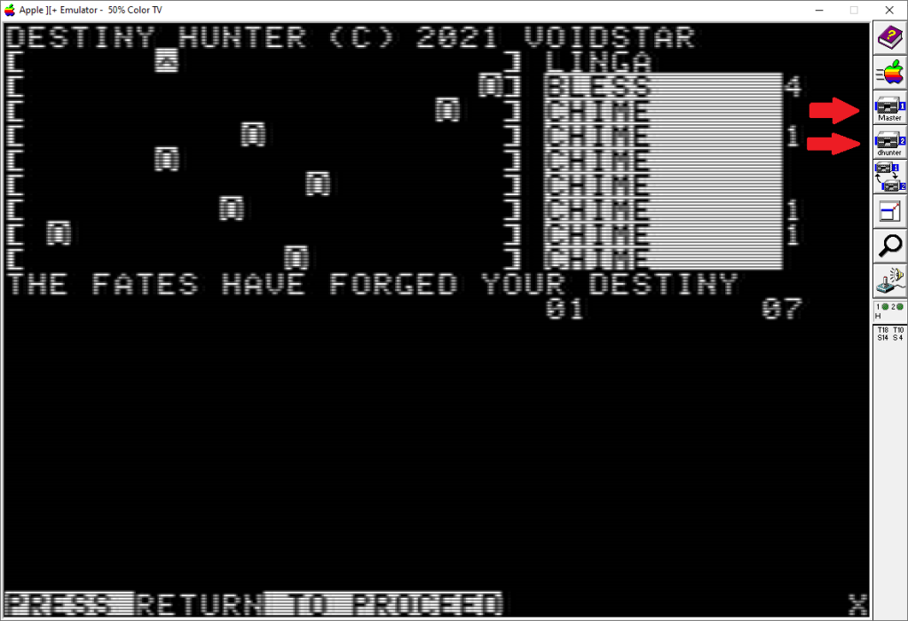 - Next, you need to insert the program into a disk drive. I inserted the original MASTER.DSK into the FIRST drive, and DHUNTER.DSK into the SECOND drive. Do this by clicking the “disk drive” icons on the right side and selecting the corresponding files.